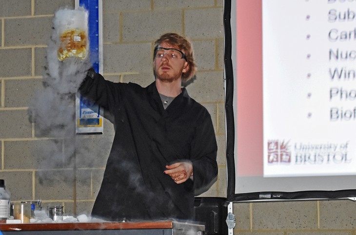 The afternoon kicked off with a bang. Exciting demonstrations of the uses and dangers of liquid nitrogen saw Dr Johnny Furze crush and crumble a frozen rubber glove into pieces.